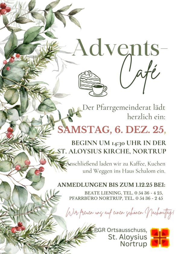 Der PGR-Ortsausschuss St. Aloysius Nortrup lädt herzlich zum Advents-Café ein. Um 14:30 Uhr wird mit einem Gottesdienst in der Kirche gestartet. Anschließend warten Torten und Weggen im Haus Schalom auf alle Gäste.