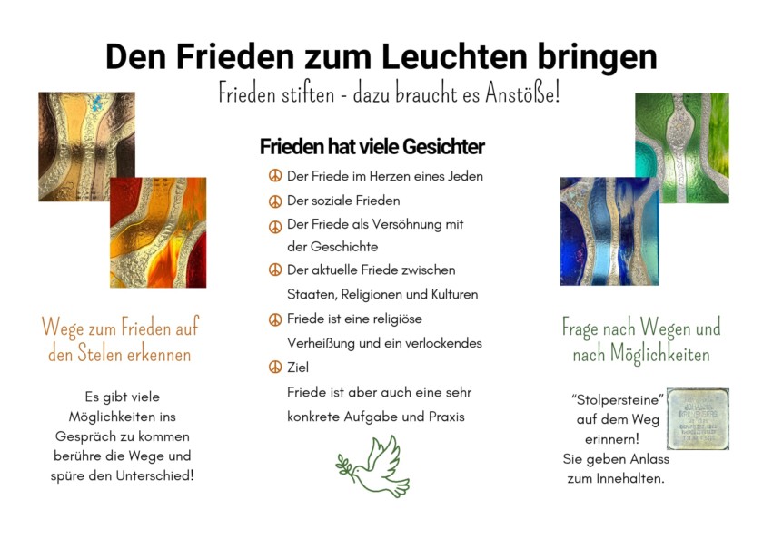 Die Initiatoren des Projektes Friedensstelen möchten gegen den bedrohten Frieden heute ein Zeichen setzten. Sie „wollen die Hoffnung auf Frieden zum Leuchten bringen“. Eine Skulptur aus sechs Stelen ist entstanden. Es sind Metallkuben mit ausgestanzten Worten, eine Auswahl aus den vielen Worten für den Frieden: z.B. Salam und shalom. Künstlerisch gestaltete Glasplatten bedecken die Kuben und werden aus dem Inneren heraus angestrahlt. Sie leuchten in intensiven Farben und zeigen Wegmotive.