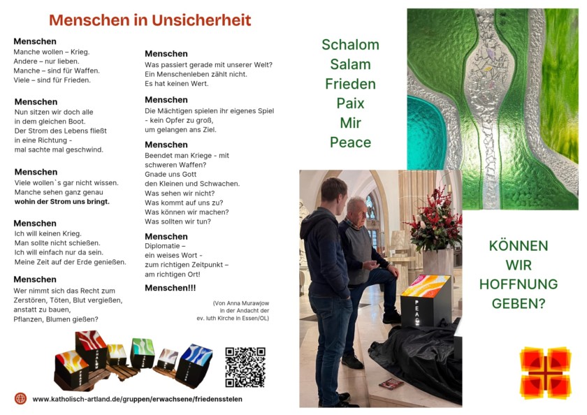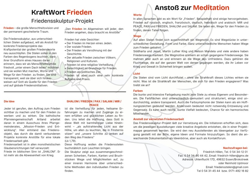 Die Stelen, so wünschen es sich die Projektgestalter aus der Katholischen Pfarreiengemeinschaft im Artland, sollen ausgeliehen werden und an immer neuen Orten Projekte für den Frieden anzetteln. Sie können in Schulen Projektwochen zu „Friedensideen“ anregen, in Kirchenräumen zu Meditation und Friedensgebeten einladen oder im Rathaus zu friedenssensiblen Stadtführungen.