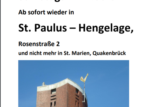 Gottesdienst Samstags 17:00 Uhr Ab sofort wieder in St. Paulus – Hengelage, Rosenstraße 2 und nicht mehr in St. Marien, Quakenbrück Hier können Sie das Plakat ansehen.