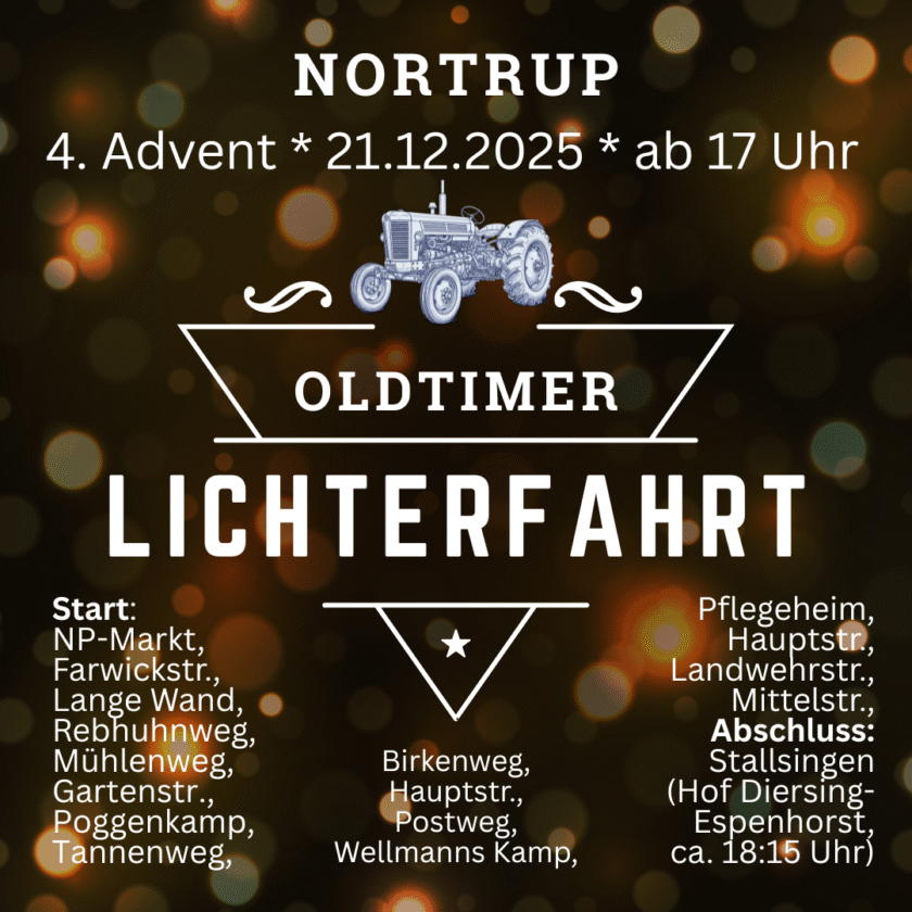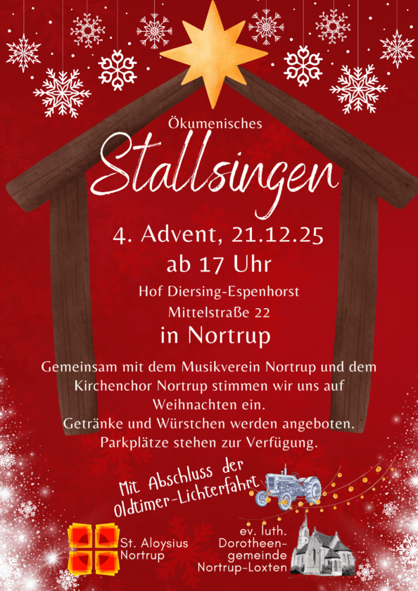 In diesem Jahr findet das Stallsingen zum ersten Mal in ökumenischer Organisation statt. Gemeinsam mit dem Kirchenchor Nortrup und dem Musikverein Nortrup wollen wir uns auf die Geburt Jesu im leeren Stall einstimmen lassen. Ein besonderes Highlight wird der Abschluss der Oldtimer-Lichterfahrt sein. Die schön beleuchteten Fahrzeuge werden auf dem Hof Diersing-Espenhorst ihre Fahrt beenden. Für das leibliche Wohl ist gesorgt. Parkplätze sind vorhanden.